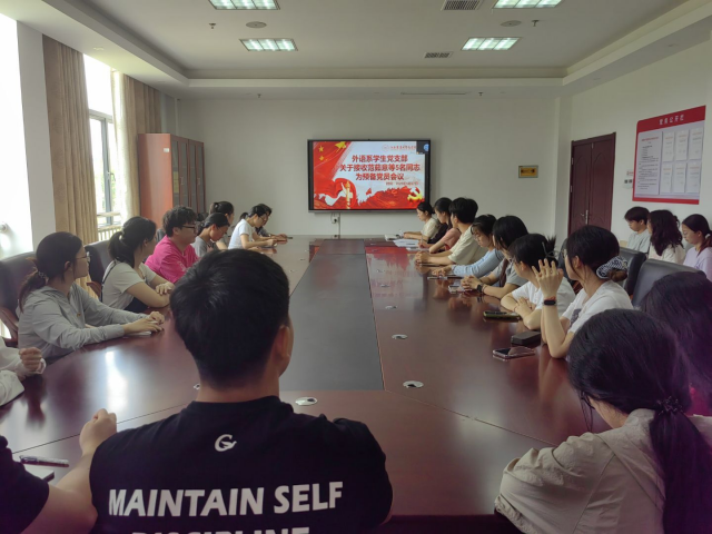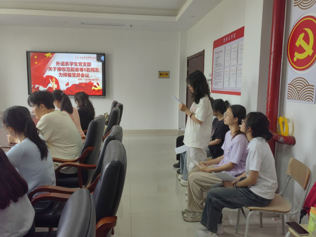 为进一步加强党组织建设,充实党员队伍力量,5月27日中午,外语系学生党支部于明道楼B221会议室召开专题学习会暨接收预备党员大会。会议由外语系学生党支部组织兼纪检委员杨青青主持,结合线上、线下两种形式开展,党支部全体党员参会。