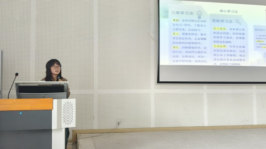 11月6日14:00,KN102教室再次迎来学习热潮,主题为“学会学习”的经验分享会为专业导论课画上圆满句号。本次课程面向英语专业全体新生,邀请汪玥月老师及三位学姐、一位学长组成嘉宾团,带来一场学习方法的“干货盛宴”。分享会聚焦写作、听力、口语、阅读&语法四大核心模块,嘉宾们结合自身深耕经验给出针对性指导。干货分享间隙,英文配音互动与结尾英文歌曲演唱环节,让学子在趣味体验中感受语言魅力,将学习氛围推向高潮。