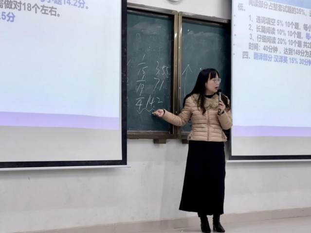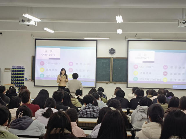 为充分发挥教师党员先锋模范作用,切实为学生解难题、办实事,助力新生高效备战全国大学英语四、六级考试,12月4日晚,语言与文法学院在厚德楼AW101教室开展英语四六级备考讲座。本次讲座特邀公共英语教研室教师杨珊主讲,吸引了全校大一、大二学生踊跃参与。